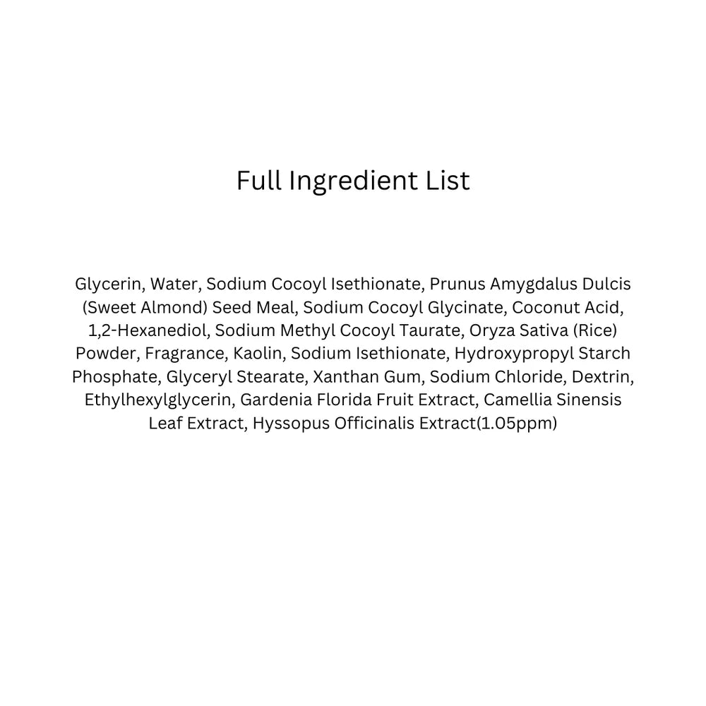 Glycerin, Prunus Amygdalus Dulcis (Sweet Almond) Seed Powder, Sodium Cocoyl Isethionate, Hyssopus Officinalis Extract, Oryza Sativa (Rice) Extract Borago Officinalis (Borage) Extract, Centella Asiatica Extract, Olea Europaea (Olive) Oil, Helianthus Annuus (Sunflower) Seed Oil, Sea Water, Mentha Arvensis Extract, Inonotus Obliquus Extract, Fragrance, Simmondsia Chinensis (Jojoba) Seed Oil, Lupinus Albus Seed Extract, Indigo Powder, Melaleuca Alternifolia Leaf Extract Chamomilla Recutita (Matricaria) Flower Extract, Sargassum Frusiforme Extract, Salix Alba (Willow) Bark Extract, Chamaecyparis Obtusa Leaf Extract, Ecklonia Cave Extract, Tocopherol, Hexyl Cinnamal