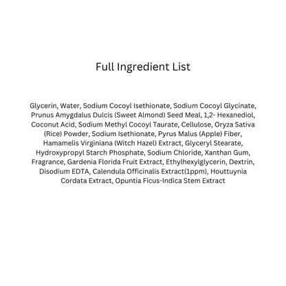 Cocoyi Taurate, Cellulose, Oryza Sativa (Rice) Powder, Sodium Isethionate, Pyrus Malus (Apple) Fiber, Hamamelis Virginiana (Witch Hazel) Extract, Glyceryl Stearate, Hydroxypropyl Starch Phosphate, Sodium Chloride, Xanthan Gum, Fragrance, Gardenia Florida Fruit Extract, Ethylhexyiglycerin, Dextrin, Disodium EDTÀ, Calendula Officinalis Extract(1ppm), Houttuynia Cordata Extract, Opuntia Ficus-Indica Stem Extract.