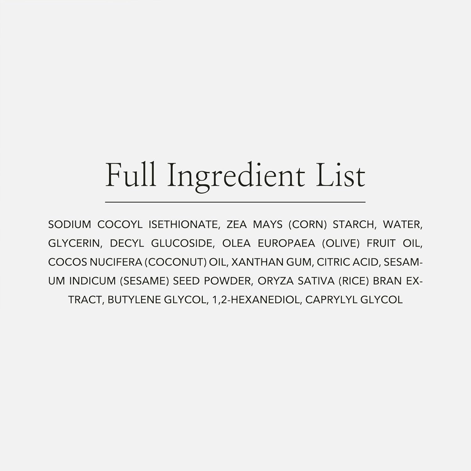 Sodium Cocoyl Isethionate, Zea Mays (Corn) Starch, Water, Glycerin, Decyl Glucoside, Olea Europaea (Olive) Fruit Oil, Cocos Nucifera (Coconut) Oil, Xanthan Gum, Citric Acid, Sesamum Indicum (Sesame) Seed Powder, Oryza Sativa (Rice) Bran Extract, Butylene Glycol, 1,2-Hexanediol, Caprylyl Glycol